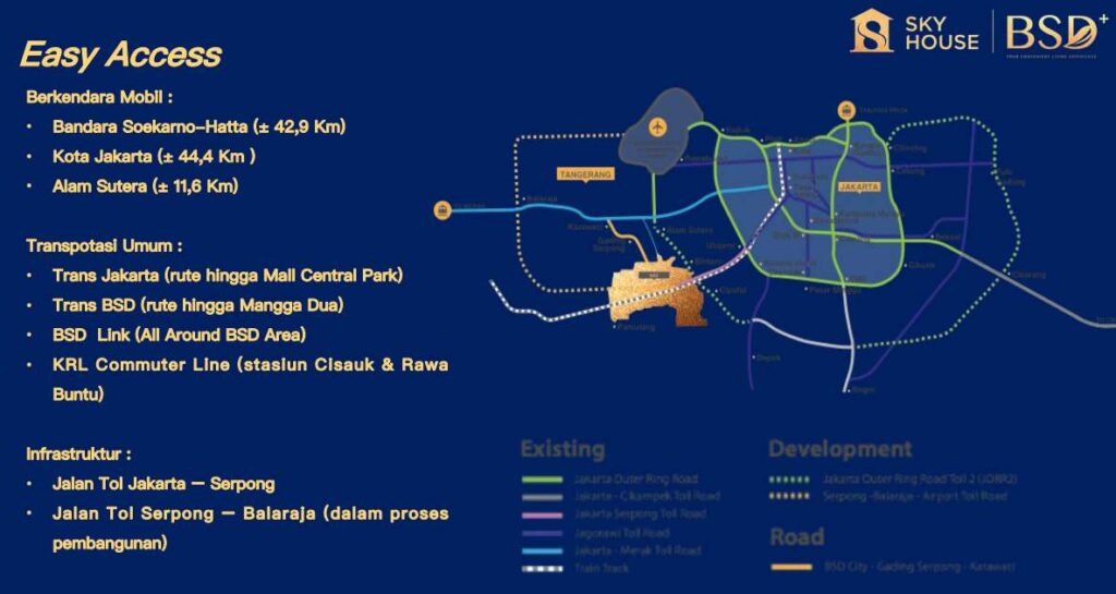 Sky house BSD+ terletak di sebelah barat Jakarta, di sebelah pusat perbelanjaan premium Jepang yang terkenal dan terhubung dengan Digital Hub, Silicon Valley masa depan Indonesia. Dengan teknologi bangunan terkini, komunitas intelijen komprehensif, dan model pengembangan hunian baru lainnya, Sky house BSD+ akan menumbangkan konsep hunian tradisional di Indonesia dengan standar modern.